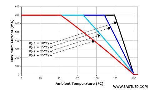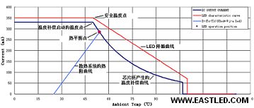 一般而言,大功率LED的產(chǎn)品規(guī)格書中都會標(biāo)明不同環(huán)境溫度(或LED焊點(diǎn)的溫度)下的最高允許輸出電流(如圖1)的曲線圖。當(dāng)四周溫度低于安全溫度點(diǎn),輸出最高允許電流保持不變;當(dāng)高于安全溫度點(diǎn),輸出最高允許電流隨四周溫度升高而下降,即所謂的降額曲線。為確保LED的性能壽命不受影響,必需保證LED工作在降額曲線與橫、縱坐標(biāo)軸所包絡(luò)的安全區(qū)內(nèi)。