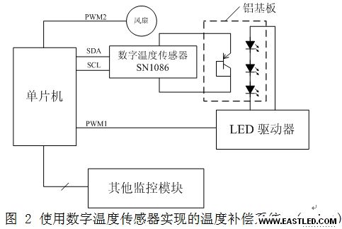 圖2為此類系統(tǒng)驅(qū)動單路LED串的示意圖。溫度檢測部分采用了矽恩微電子公司生產(chǎn)的高精度數(shù)字溫度傳感器SN1086,SN1086可以同時檢測芯片本身溫度,相當(dāng)于間接檢測PCB溫度,又能檢測遠(yuǎn)端三級管溫度,若將三極管與LED一同焊接在鋁基板上便可以檢測鋁基板溫度。SN1086將檢測到的兩種溫度通過芯片內(nèi)部的高精度Delta-Sigma ADC進(jìn)行模數(shù)轉(zhuǎn)換,將溫度的數(shù)字成果通過I2C總線的SDA數(shù)據(jù)線和SCL時鐘線與單片機(jī)通信。當(dāng)單片機(jī)接收到鋁基板溫度成果后與預(yù)設(shè)定的安全溫度點(diǎn)閾值進(jìn)行比對,當(dāng)溫渡過高時啟動溫度補(bǔ)償程序,通過PWM1按比例下降LED驅(qū)動器的輸出電流。單片機(jī)同時監(jiān)控PCB板溫度,溫渡過高時通過PWM2信號線把持風(fēng)扇對PCB進(jìn)行散熱,確保板上的元器件尤其是電解電容的溫度不會過高?!?br /> 這種系統(tǒng)把持極大加強(qiáng)了系統(tǒng)的穩(wěn)固性,并保證整體系統(tǒng)的應(yīng)用壽命,實(shí)踐證實(shí)系統(tǒng)內(nèi)部溫度得到很好地把持,但硬件本錢較高,適于中高端范疇的利用。