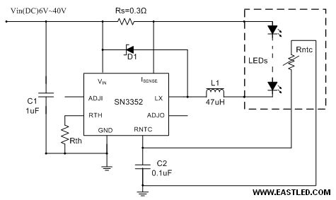 若能將溫度補(bǔ)償功效集成在芯片內(nèi)部,這將極大下降應(yīng)用本錢和所占空間。SN3352正是為了這個目標(biāo)而設(shè)計(jì)出來的芯片,SN3352是降壓型DC-DC恒流芯片,工作電壓范疇6~40V,輸出電流達(dá)700mA,溫度補(bǔ)償未啟動時恒流性能精良,實(shí)用于驅(qū)動串聯(lián)的1W或者3W LED燈。SN3352具備調(diào)光功效,通過轉(zhuǎn)變ADJI引腳的模仿電壓或者對此引腳施加PWM信號都能實(shí)現(xiàn)調(diào)光功效。SN3352內(nèi)部集成了矽恩微電子自有專利技巧的溫度補(bǔ)償電路,溫度補(bǔ)償功效需要外接一個普通電阻Rth用于設(shè)置溫度補(bǔ)償啟動的溫度點(diǎn)Tth和一個檢測溫度的負(fù)溫度系數(shù)熱敏電阻Rntc配合實(shí)現(xiàn)。