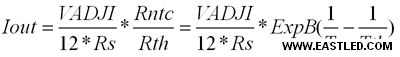 當(dāng)Rntc>Rth時,溫度補(bǔ)償未啟動,輸出電流保持不變,大小由設(shè)置電流電阻Rs和ADJI引腳電壓決定: