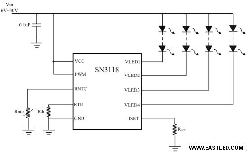 另一款具備溫度補(bǔ)償功效的LED線性恒流源驅(qū)動器是SN3118,其輸出電流可由外接電阻編程,合適20mA~200mA的低電流LED利用。SN3118工作電壓6V~30V,四個支路電流之間匹配度±5%以內(nèi),每路最大電流才能達(dá)175mA,工作時無EMI標(biāo)題。電路中同樣應(yīng)用一個普通電阻和負(fù)溫度系數(shù)的熱敏電阻實(shí)現(xiàn)溫度補(bǔ)償,當(dāng)熱敏電阻阻值降落至普通電阻阻值時,溫度補(bǔ)償啟動。