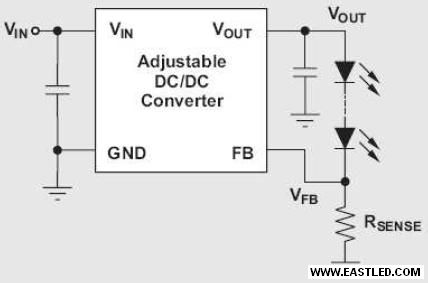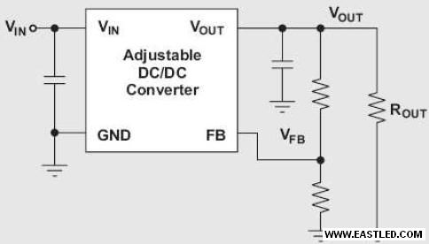如圖1所示,為了從輸進電壓供給較高或較低的調節(jié)輸出電壓,任何可調式DC/DC 轉換器都能夠加以修正。在這類配置中,假如假設 ROUT 純粹是電阻負載,則VOUT = IOUT × ROUT。當DC/DC 轉換器用來給LED供電時,它會借著調節(jié)下端FB電阻把持通過LED的電流,如圖2 所示。由于負載本身(LED)代替上端FB電阻的緣故,傳統(tǒng)的小信號把持回路公式不再實用。DC 負載阻抗為