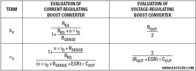 盤算兩種電路的負載周期D以及VOUT與REQ的修正值所應用的方法都雷同。Sn 及Se分辨是升壓轉換器的自然形成電感斜率與補償斜率,而fSW是切換頻率。關于電壓調節(jié)升壓轉換器的小信號模型與電流調節(jié)升壓轉換器的模型,兩者之間真正的差別來自乘以跨導用項(1–D)/Ri 的抗阻KR以及重要電極wp。這些差別已在表1予以概述。具體信息請見參照 1。由于在調節(jié)電壓的轉換器中,RSENSE 值一般遠低于 ROUT 值,因此,電流調節(jié)轉換器的增益 (其中 ROUT = REQ) 幾乎都低于電壓調節(jié)轉換器的增益。