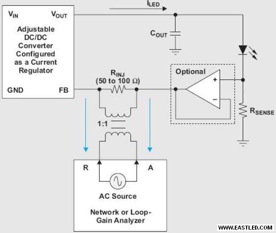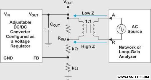 若要丈量把持回路增益與電壓調節(jié)轉換器的相位,網(wǎng)絡或專用回路增益/相位分析儀一般會應用1:1變壓器將小信號通過小阻抗(RINJ)注進回路中。然后,分析儀便會根據(jù)頻率丈量并比擬A點的注進信號與R點的回傳信號,之后,報告幅度差別(增益)與時間延遲(相位) 的比例。只要A點的阻抗遠低于 R 點的阻抗,即可在回路中的任一處插進此阻抗,否則注進的信號會過大,因而干擾轉換器的運作點。如圖 5 所示,高阻抗節(jié)點是一般插進此阻抗的地位,也是FB電阻在輸出電容(低阻抗節(jié)點) 偵測輸出電壓的處所。