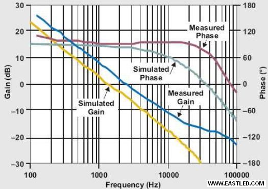 圖7:在VIN =5V且ILED=350mA的情況下所測得及模仿的回路增益與相位