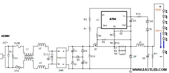 非隔離的應用的LED 日光燈電源,以臺灣廣鵬科技公司的A704WFT為例,A704WFT的MOS 管外掛,其基礎線路如圖1所示: