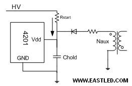 PT4201通過一個(gè)連接到高壓線上的電阻Rstart對(duì)連接在Vdd腳上的電容Chold充電實(shí)現(xiàn)啟動(dòng)。在上電之初,Chold電容上的電壓為0,PT4201處于關(guān)斷狀態(tài),從Rstart上流下的電流對(duì)Chold進(jìn)行充電從而使Vdd電壓升高,當(dāng)Vdd腳電壓達(dá)到芯片啟動(dòng)電壓VDD-ON之后PT4201開端工作,工作之后流進(jìn)Vdd電流增加,由幫助繞組開端對(duì)芯片進(jìn)行供電。