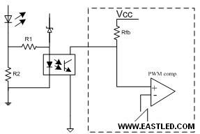 PT4201采用光耦檢測(cè)輸出LED串的電流并通過轉(zhuǎn)變輸出脈沖占空比達(dá)到輸出電流把持目標(biāo)。如圖3所示,當(dāng)LED電流達(dá)到設(shè)定值時(shí),LED電流在采樣電阻R2上的壓降達(dá)到光耦發(fā)光管導(dǎo)通電壓,發(fā)光管導(dǎo)通使FB電壓降落,PT4201根據(jù)FB電壓的大小轉(zhuǎn)變輸出脈沖占空比實(shí)現(xiàn)恒定電流輸出。