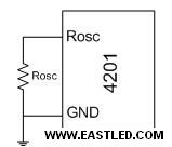 PT4201的Rosc引腳為設(shè)定PWM頻率供給了方便,用一個(gè)電阻接在Rosc引腳和GND之間可以對(duì)PWM頻率進(jìn)行設(shè)定(圖4)。PWM頻率與設(shè)定電阻之間的關(guān)系遵守以下關(guān)系:Fosc=6500/Rosc。FOSC單位KHz,Rosc單位Kohm。