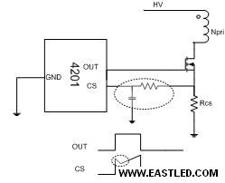 PT4201的OUT腳用來驅(qū)動(dòng)功率MOSFET的柵極。優(yōu)化設(shè)計(jì)圖騰柱情勢(shì)輸出的驅(qū)動(dòng)才能使驅(qū)動(dòng)強(qiáng)度和EMI得到良好的調(diào)和。同時(shí),OUT的輸出高電位被限制到了18V,從而可以保護(hù)由于VDD升高可能對(duì)MOSFET造成的損傷。內(nèi)部OUT和GND之間有一個(gè)電阻,可以在芯片不工作時(shí)將外部MOSFET的柵極可靠置為0電位。