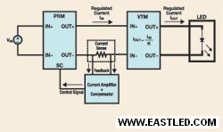 V·I芯片PRM整流器和VTM電壓變換器用來供給穩(wěn)固的電壓。為了應用PRM和VTM給LED供電,需要修正PRM的工作方法以供給穩(wěn)固的電流。這是通過采用電放逐大器和補償器來實現(xiàn)的。