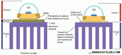 最好的調(diào)和措施是將LED焊接在PCB板上,PCB再用膠水粘合到金屬散熱器上。這樣PCB作為電路板的初始功效就可以得到保持。固然PCB存在很多不同的熱導(dǎo)率,但它們?nèi)匀皇菬徂D(zhuǎn)移的一個(gè)障礙。