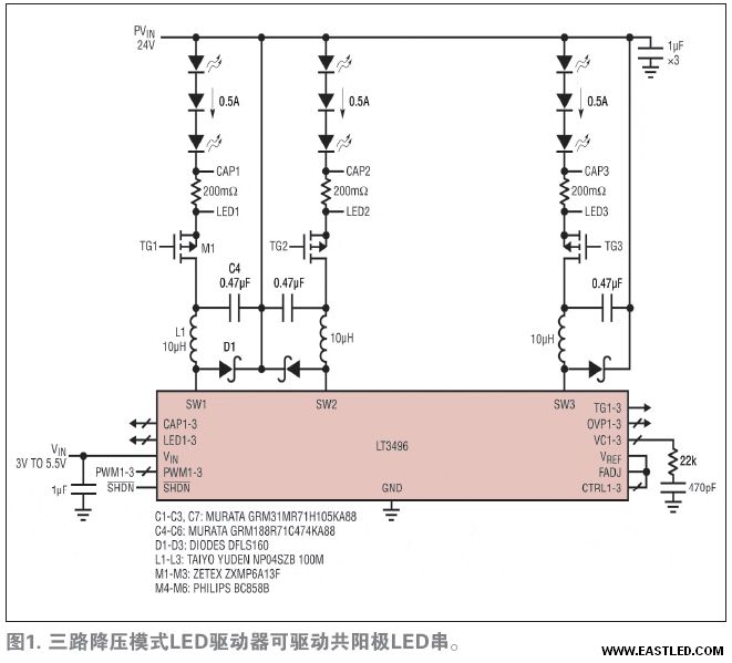 圖1:三路降壓模式LED驅(qū)動器可驅(qū)動共陽極LED串。