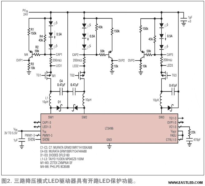 圖2:三路降壓模式LED驅(qū)動用具有開路LED保護功效。