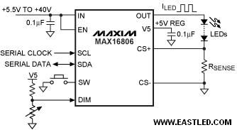圖1:350mA線性HB LED驅(qū)動(dòng)器IC MAX16806能夠省往微把持器或開關(guān)模式轉(zhuǎn)換器