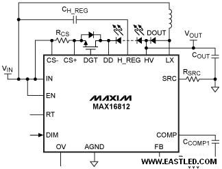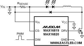 與用于驅(qū)動(dòng)HB LED的一般buck把持器不同,MAX16819、MAX16820、MAX16822和MAX16832 HB LED驅(qū)動(dòng)器采用滯回把持,沒有把持環(huán)路補(bǔ)償,從而簡化了設(shè)計(jì),有助于減少外部器件數(shù)目。集成高壓電流檢測(cè)放大器,能夠工作在高達(dá)2MHz的開關(guān)頻率,有效下降電路板空間和元件數(shù)目,可幻想用于汽車前后部的照明(RCL、DRL、霧燈/近光燈)。