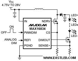 圖4所示HB LED驅(qū)動(dòng)器電路用于汽車中LCD背光,MAX16834集成了高邊檢放逐大器、PWM調(diào)光MOSFET驅(qū)動(dòng)器和高度可靠的保護(hù)電路,大大簡化了LCD背光電路的設(shè)計(jì)。該款HB LED驅(qū)動(dòng)器能夠供給3000:1 PWM調(diào)光范疇,輸進(jìn)電壓范疇為4.75V至28V,在冷啟動(dòng)和拋負(fù)載狀態(tài)下確保穩(wěn)固工作。