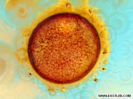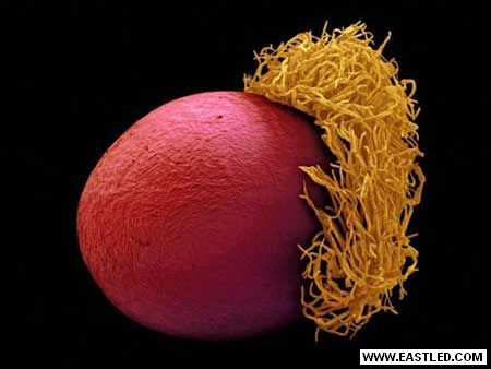人工試管受精 這張顯微照片明白地捕捉到人工試管受精(IVF)過(guò)程。圖中的卵細(xì)胞(棕色球體)要比精子細(xì)胞大很多,其四周繚繞著保護(hù)積云細(xì)胞(圖中黃色部分),卵細(xì)胞四周的薄膜是卵膜,精子頭部攜帶著酶試圖溶解卵膜,從而與卵細(xì)胞聯(lián)合。圖片是由斯匹克-沃克爾(SpikeWalker)供給的。