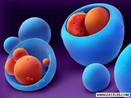 顯微鏡下的藥物膠囊 共聚物又稱(chēng)為共聚體,是由兩種或兩種以上不同單體經(jīng)聚合反應(yīng)而得的聚合物。共聚物可用于制作藥物膠囊,它負(fù)責(zé)裝載藥物微粒;聚合物不溶于酸性溶液,因此它們可用于制成藥物涂層,從而避免人體吞服藥物時(shí)藥物在胃中溶化,或者通過(guò)緩慢消溶聚合物,逐漸開(kāi)釋藥物效率,減少服藥次數(shù)。 如圖所示,圖中橙色部分是藥物膠囊中的內(nèi)部微粒。這種膠囊是脫氫皮質(zhì)醇藥物,用于治療腸炎。外部呈藍(lán)色的顆粒是共聚物,負(fù)責(zé)裝載這些藥物微粒。圖片是由安妮-卡瓦納(AnnieCavanagh)供給的。