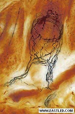 這張顯微圖像顯示的是毛囊的感到神經(jīng)末梢。感到神經(jīng)末梢(sensorynerveending)是感到神經(jīng)元四周突的終末部分,該終末與其他結(jié)構(gòu)共同組成感受器。感受器能接收內(nèi)、外環(huán)境的各種刺激,并將刺激轉(zhuǎn)化為神經(jīng)激動(dòng),傳向中樞,產(chǎn)生感到。圖中的色彩是將該組織用硝酸銀處理后浮現(xiàn)的,如同處理膠片一般。神經(jīng)軸突是正在消褪的玄色部分。照片是由斯匹克-沃克爾(SpikeWalker)供給的。
