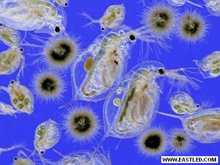 海洋浮游生物 這是斯匹克-沃克爾拍攝的浮游生物顯微照片。拍攝時(shí)采用了萊因伯格照明法,憑借有色盤(pán)供給的鮮艷色彩,使快速移動(dòng)的浮游生物在明亮藍(lán)色調(diào)下明白可見(jiàn)。 海洋浮游生物是非常小的有機(jī)生物,漂浮在海面上,很少或不具備移動(dòng)才能。海洋浮游生物分為兩大類(lèi)型:浮游植物和浮游動(dòng)物。浮游植物是植物性浮游生物,在海面以下較淺的水深漂浮,依附光合作用獲得能量;浮游動(dòng)物是包含小型原活潑物和多細(xì)胞動(dòng)物在內(nèi)的動(dòng)物,它們重要以浮游生物為食。