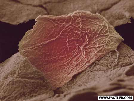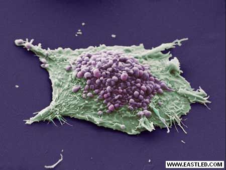 肺癌細(xì)胞培基長(zhǎng)出的單細(xì)胞 這張電子掃描顯微照片也是由安妮-韋斯頓(AnneWeston)拍攝的,它顯示從肺癌細(xì)胞培基上長(zhǎng)出的單細(xì)胞,其中不對(duì)稱(chēng)紫色崛起叫做“大皰”,它與癌細(xì)胞產(chǎn)生質(zhì)膜的細(xì)胞骨架呈現(xiàn)局部分別。 起泡對(duì)于包含細(xì)胞移動(dòng)、細(xì)胞決裂、物理和化學(xué)應(yīng)力的多樣性細(xì)胞變更過(guò)程非常重要。