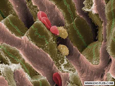 老鼠肝臟細(xì)胞 這張顯微圖片顯示的是老鼠肝臟的內(nèi)部結(jié)構(gòu),有助于懂得該復(fù)雜器官。呈正弦曲線的血管是圖中遍及肝臟內(nèi)部的粉紅色結(jié)構(gòu),血管中包含著血紅細(xì)胞和庫(kù)普弗細(xì)胞,它們是肝臟內(nèi)部的巨噬細(xì)胞。肝細(xì)胞是圖中褐色部分,繚繞著正弦曲線血管排列著。 膽汁被分泌進(jìn)小管之中,圖中以綠色管道顯示,它們是肝細(xì)胞之間擴(kuò)大的細(xì)胞間隙,膽汁在其中流向小腸。