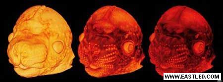 早期胚胎發(fā)展階段的老鼠頭部 這張3D圖片顯示的是早期胚胎發(fā)展階段的老鼠頭部,是由高明白反相顯微鏡拍攝的。在拍攝過(guò)程中,樣本放在塑料片上,然后涂上曙紅熒光色。這種顯微鏡薄片切片機(jī)可切割非常薄的樣本,最薄達(dá)到2微米。 應(yīng)用盤(pán)算機(jī)軟件,老鼠頭部的不同結(jié)構(gòu)得以成像。圖片是由英國(guó)醫(yī)學(xué)研究理事會(huì)所供給的。