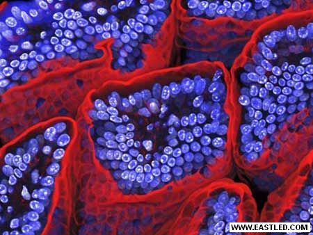 老鼠小腸內(nèi)壁3D結(jié)構(gòu) 如圖所示,這是應(yīng)用多光子熒光方法浮現(xiàn)的老鼠小腸的內(nèi)壁3D結(jié)構(gòu),在小腸內(nèi)壁的指狀長(zhǎng)茸毛可增大小腸內(nèi)壁表面積,因而有助于消化。通過(guò)聯(lián)合多張圖片的觀測(cè),保羅-阿普爾頓(Paul Appleton)和他的同事們得以調(diào)查結(jié)腸癌導(dǎo)致的小腸內(nèi)病變。照片是由保羅-阿普爾頓(Paul Appleton)供給。