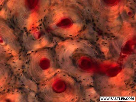 人體股骨的密質(zhì)骨骼 如圖所示,這是人體股骨的密質(zhì)骨骼圖像,其中顯示出包含血管和結(jié)締體素的微型管道網(wǎng)絡(luò)。密質(zhì)骨使人體骨骼堅(jiān)硬有力,它是由多層有機(jī)物質(zhì)和無(wú)機(jī)鹽構(gòu)成的。 存活的密質(zhì)骨細(xì)胞在樣本制備過(guò)程中已被摧毀,留下小孔。空氣充滿(mǎn)在在這些小孔之中,由于視覺(jué)折射作用應(yīng)用這些小孔浮現(xiàn)出玄色。圖片是由艾弗-梅森(IvorMason)拍攝并供給的。