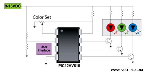 圖中的PIC12HV615閃存微把持器整合了分流穩(wěn)壓器、供給8MHz時(shí)鐘的振蕩器、重設(shè)電路和模仿數(shù)字轉(zhuǎn)換器,供給一個(gè)完整而機(jī)動(dòng)的單芯片解決計(jì)劃。此閃存組件的電路內(nèi)可程序化功效也答應(yīng)在生產(chǎn)時(shí)履行色彩校準(zhǔn)過(guò)程,從而為補(bǔ)償各種發(fā)光器的性能差別和組件之間的差別供給了一種方法。 @@@@@@@@@@